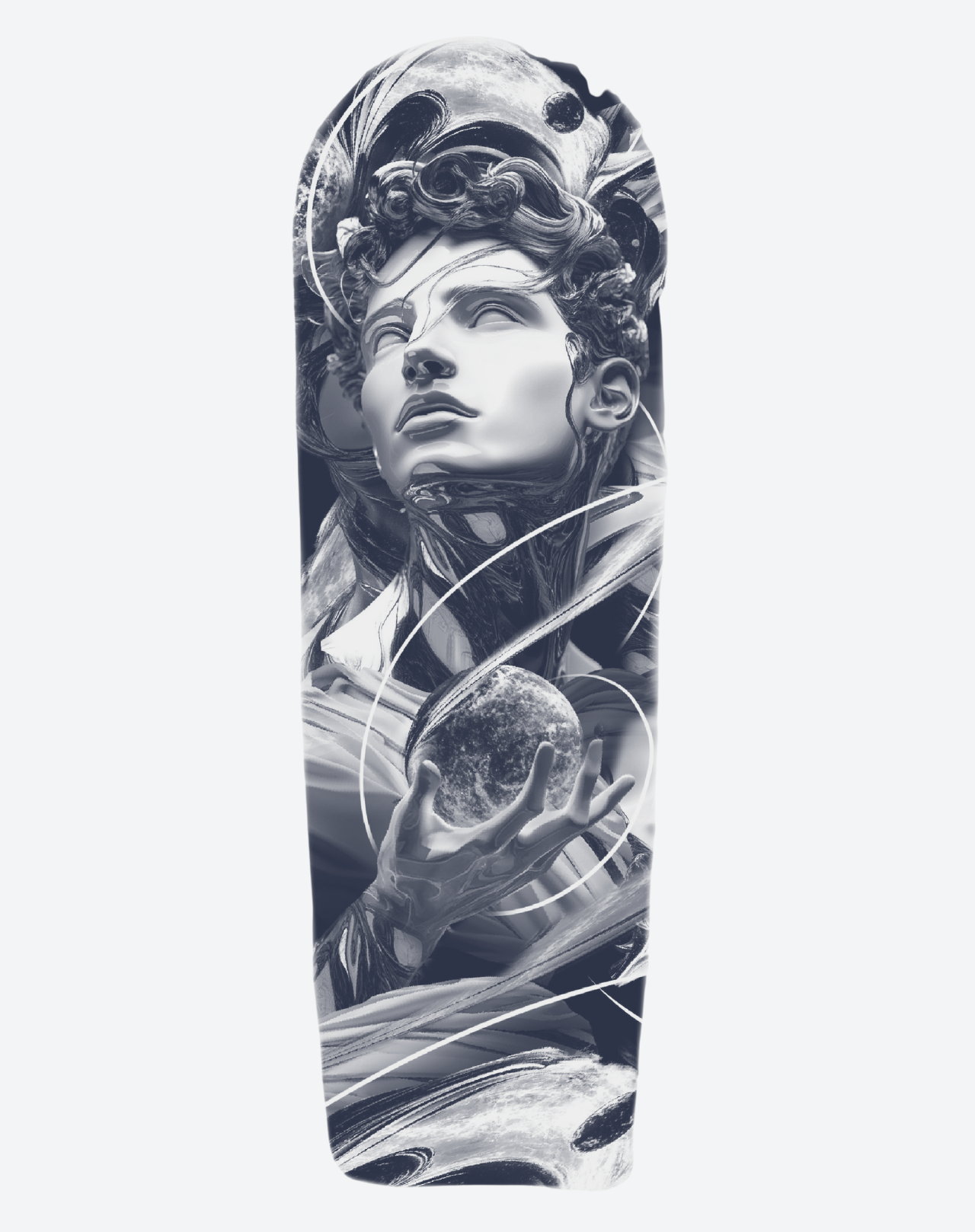 Eternal Orbit is a 7×19 inch design by @alexitattoos, capturing a celestial figure suspended between divinity and cosmic wonder. With an upward gaze that channels transcendence, the figure clutches a darkened planet, embodying both creation and control. Flowing lines and lunar motifs encircle the composition, evoking movement, destiny, and the infinite cycles of the universe. A striking fusion of realism and surrealism, this 1–2 week EZINK temporary tattoo is perfectly suited for a full sleeve placement, radiating power, mystery, and otherworldly beauty.