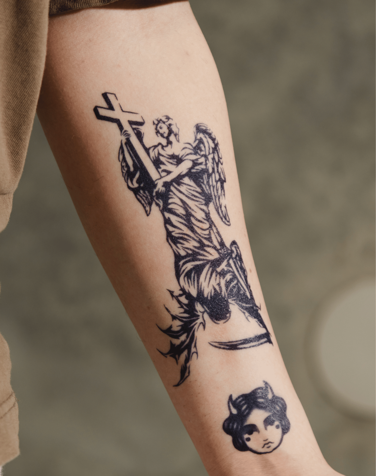 Introducing Mirrored, the 4×7 inch EZINK temporary tattoo that lasts 1-2 weeks. Created by mahlo_tattoo, this tattoo features a stunning design of an angel holding a cross and the grim reaper. Show off your edgy yet spiritual side with this unique and long-lasting tattoo.