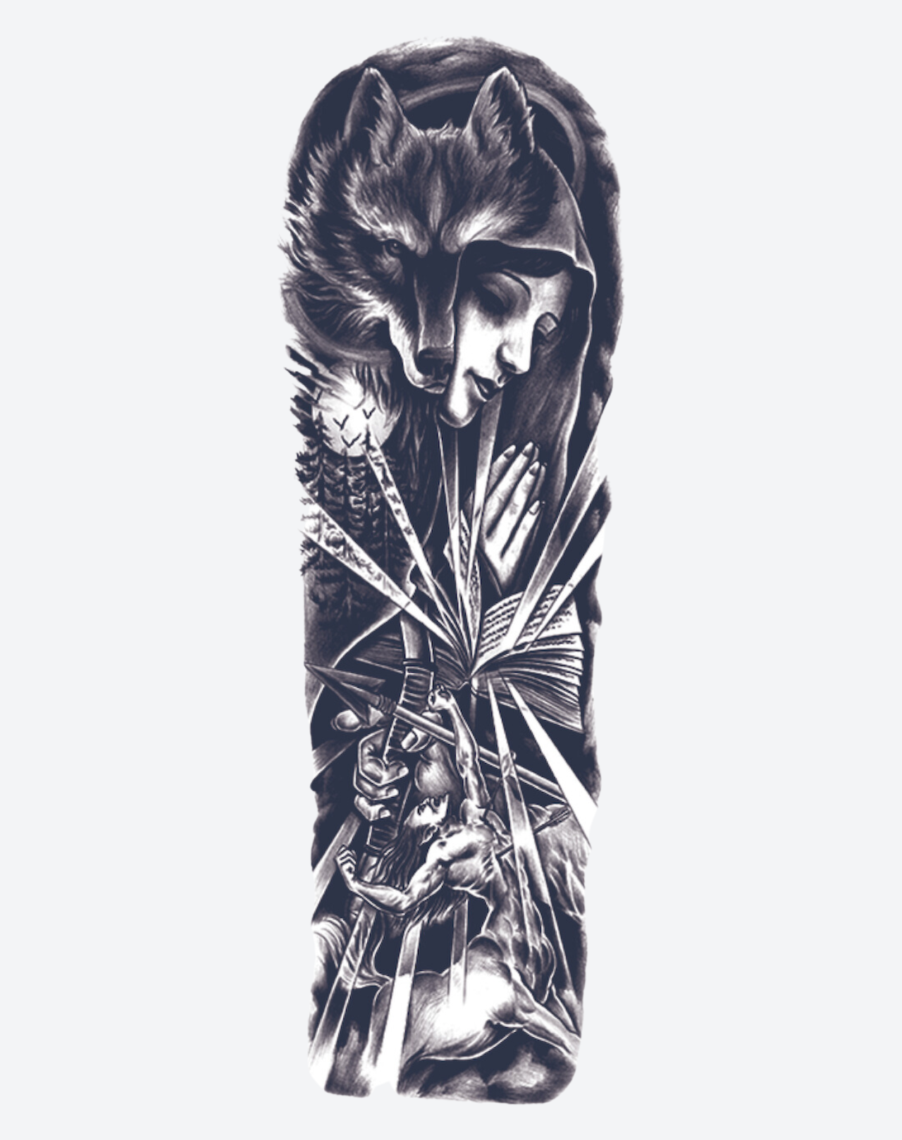 Introducing the Red Hood Sleeve! A temporary tattoo sleeve that embodies the beauty and mystique of a wolf, forest, and a mysterious hooded girl. Lasting up to 2 weeks, this accessory will add a touch of strength to your look. Perfect for those who crave adventure and embrace their inner wildness!