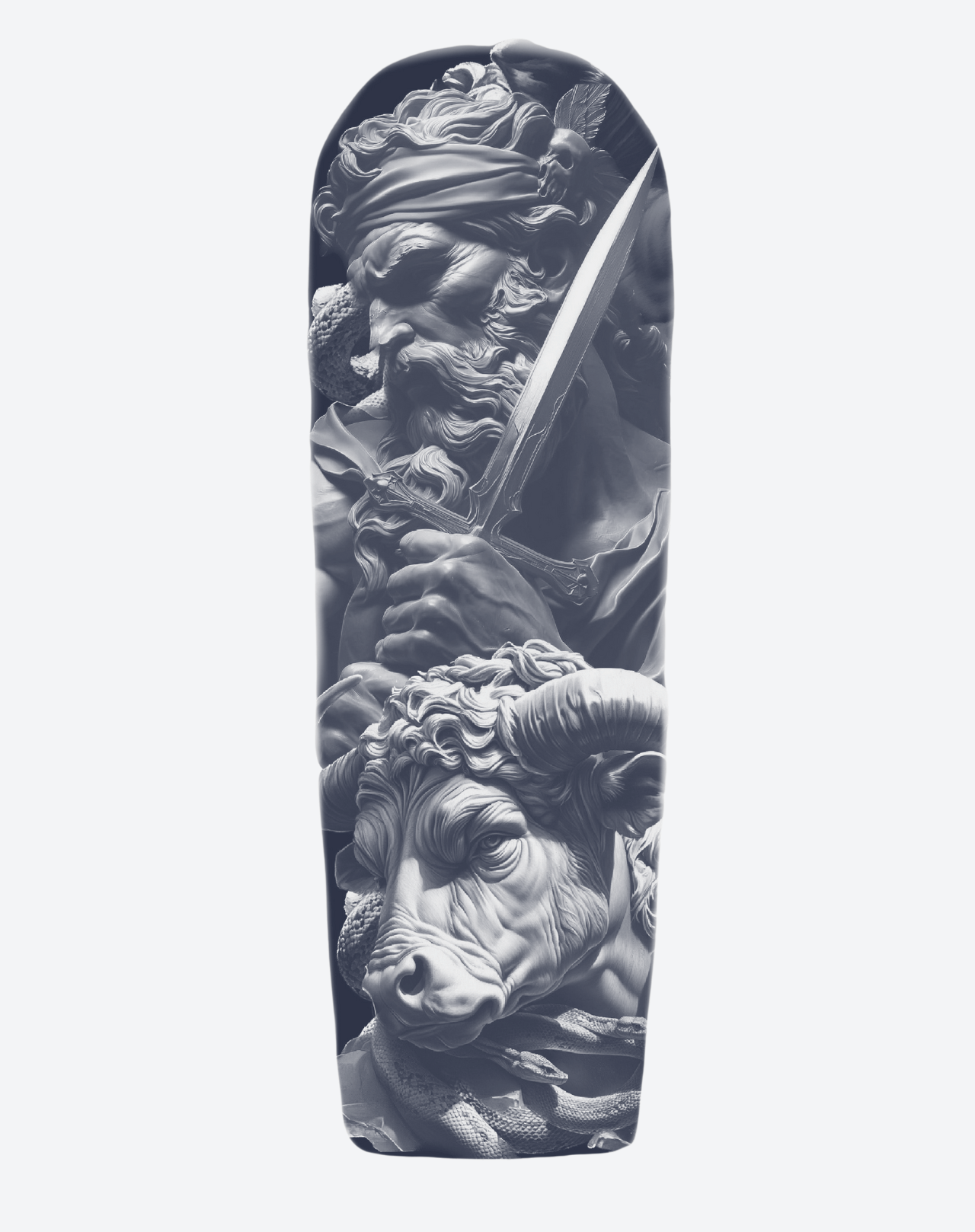 Sacrifice Ram is a 7×19 inch design by @alexitattoos, portraying a solemn moment of devotion and struggle. A powerful, bearded figure grips a blade with unwavering resolve, while a ram—etched in lifelike realism—stands as the embodiment of sacrifice. The sculptural detail and intensity of expression evoke themes of faith, loyalty, and the heavy cost of destiny. Monumental in presence and rich in symbolism, this sleeve design is a striking emblem of strength and surrender. This 1–2 week EZINK temporary tattoo is perfectly suited for full sleeve placement.
