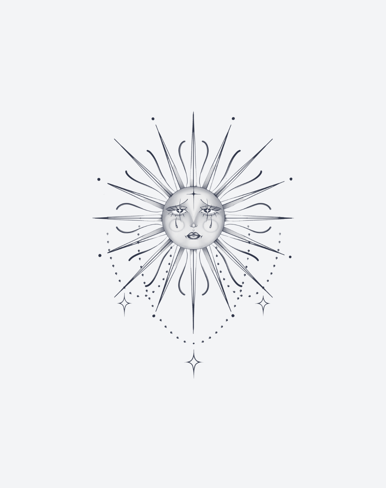 Sol Weeps is a 4×4 inch design by @lorrainy.tatts, portraying a sorrowful sun whose tears fall like starlight. Intricate rays extend outward in a balanced halo, surrounded by delicate dots and celestial accents, blending warmth with melancholy. This striking 1–2 week EZINK temporary tattoo symbolizes endurance through grief, the coexistence of light and loss, and the eternal cycles of renewal.