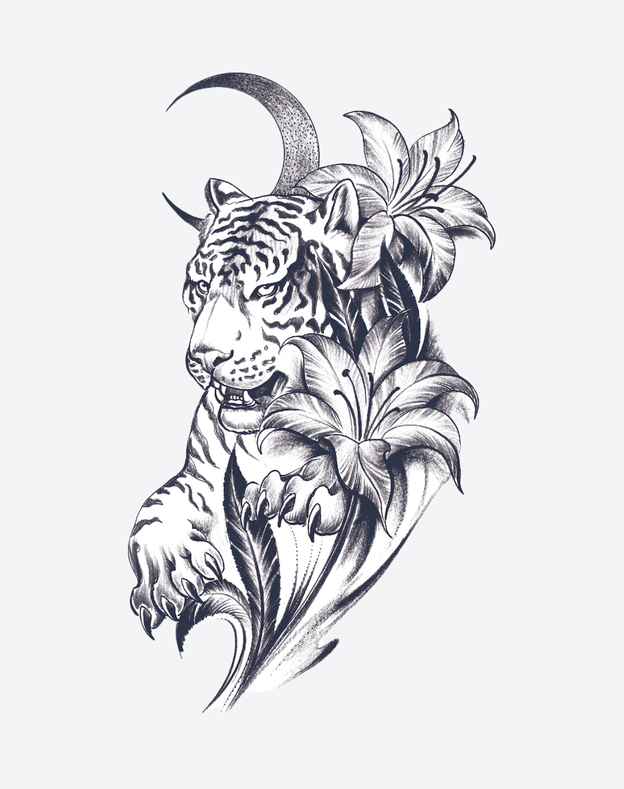 Enhance your look with a realistic 4×7 inch temporary tattoo of a powerful wildcat hunting amidst beautiful flowers. With a lasting duration of 1-2 weeks, express your untamed spirit and love for nature.